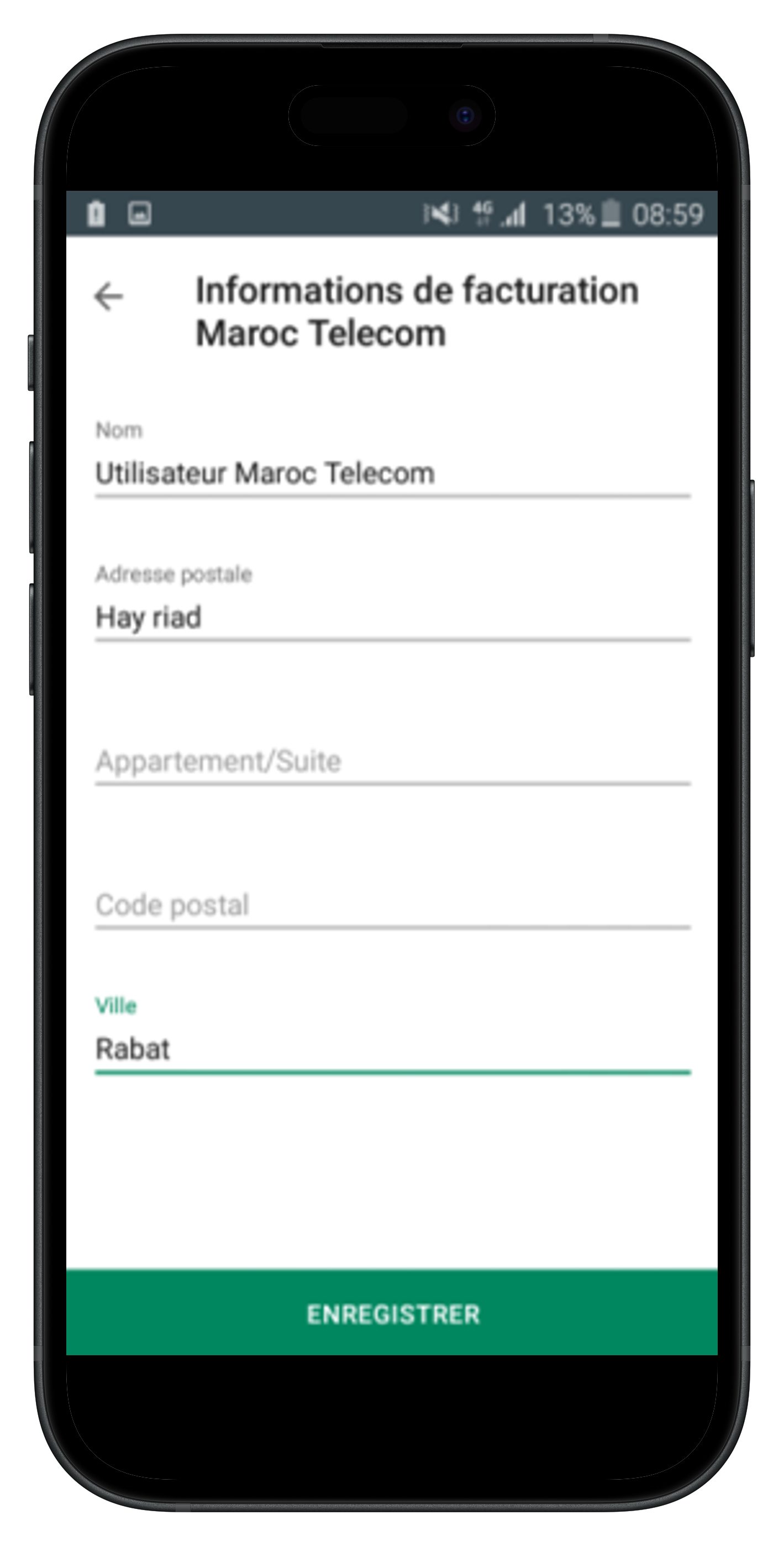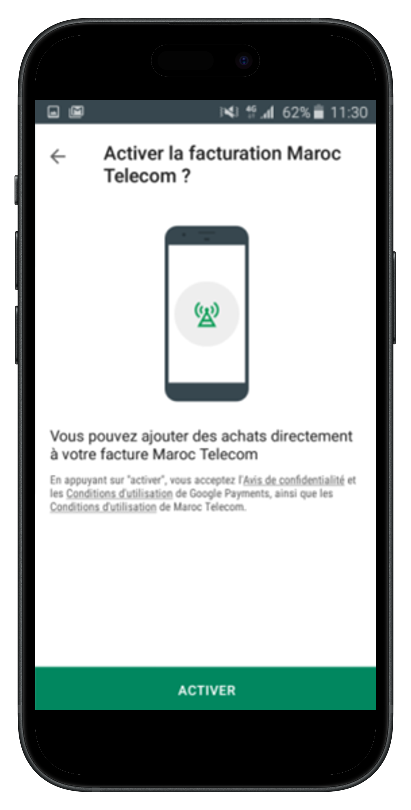 Choisissez l'option "Utiliser la facturation Maroc Telecom" et cliquez sur "Activer". Un SMS, commençant par "DCB", est envoyé automatiquement pour vous authentifier.